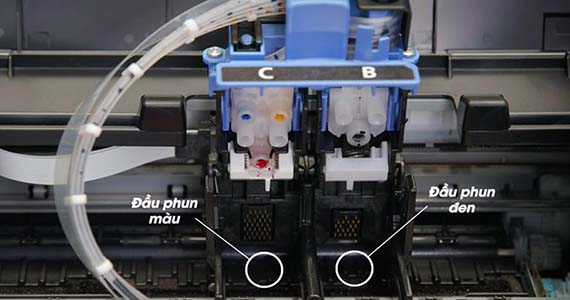 Bước 3: Lắp đặt đầu phun màu và đầu phun đen vào vị trí như trong hình. Với ký hiệu chữ B là đầu phun đen còn ký hiệu chữ C là vị trí đầu phun màu.